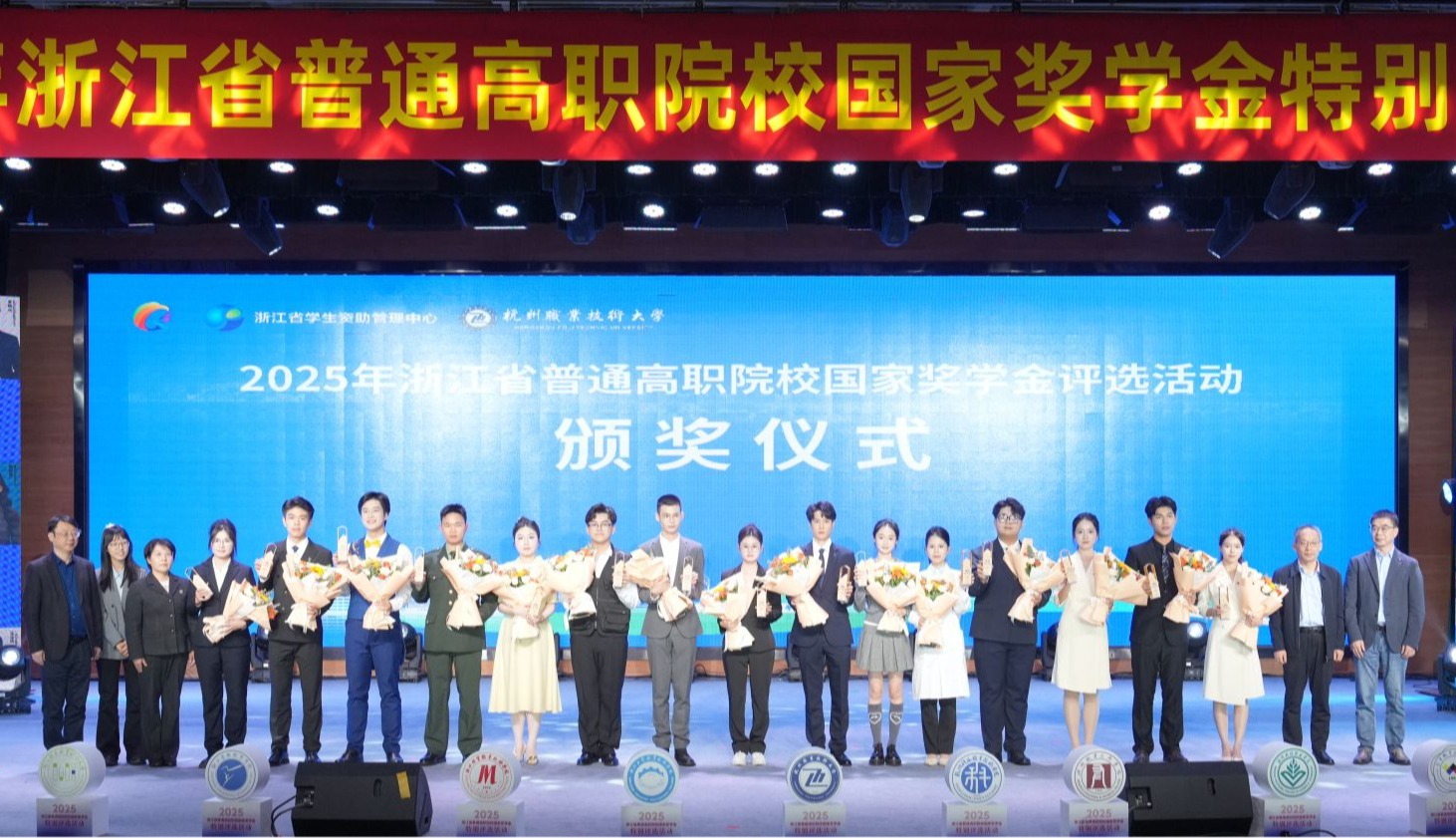 展示环节,选手们结合专业学习、科研竞赛等领域分享成长故事。他们中既有手握专利的技术尖兵,也有反哺乡邻的实践先锋,充分展现浙江高职学子的综合素养与责任担当。评选采用评审系统现场投票,经过激烈角逐,我校学子钱诗蝶等10名学生获得2025年浙江省普通高职院校国家奖学金特别推荐资格,这也是我校第五次获此资格。